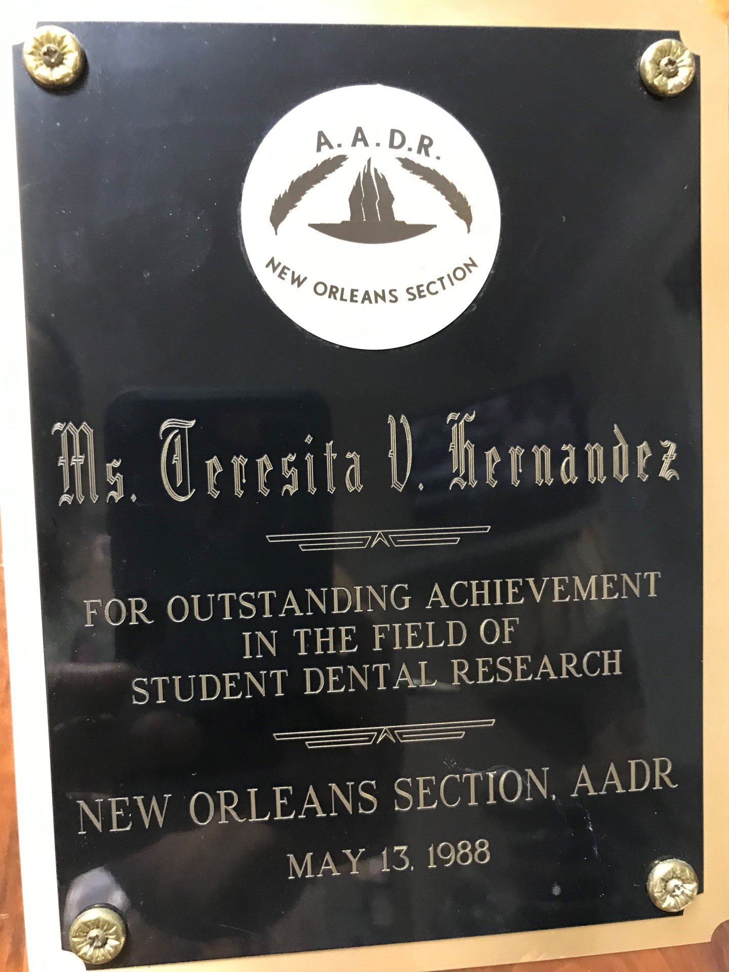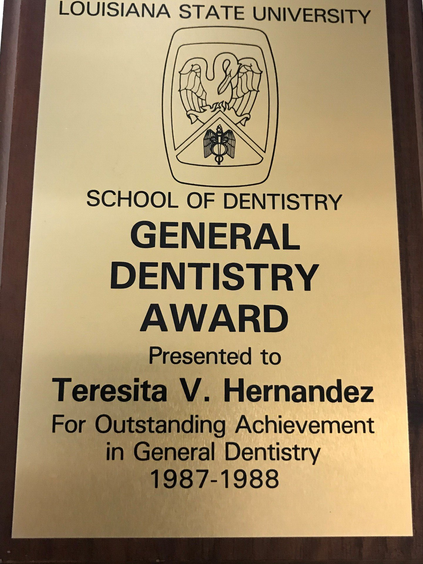 Dr. Teresita, or Teri as her colleagues call her, graduated from Louisiana State University School of Dentistry (LSUSD) in 1988 with her general dentistry degree. She was honored to receive the General Dentistry Award granted to top students in Dental Clinics. She also received other awards, including Best Female Dentist Award, Geriatric Dentistry Award, and the American Association of Dental Research Award (AADR).